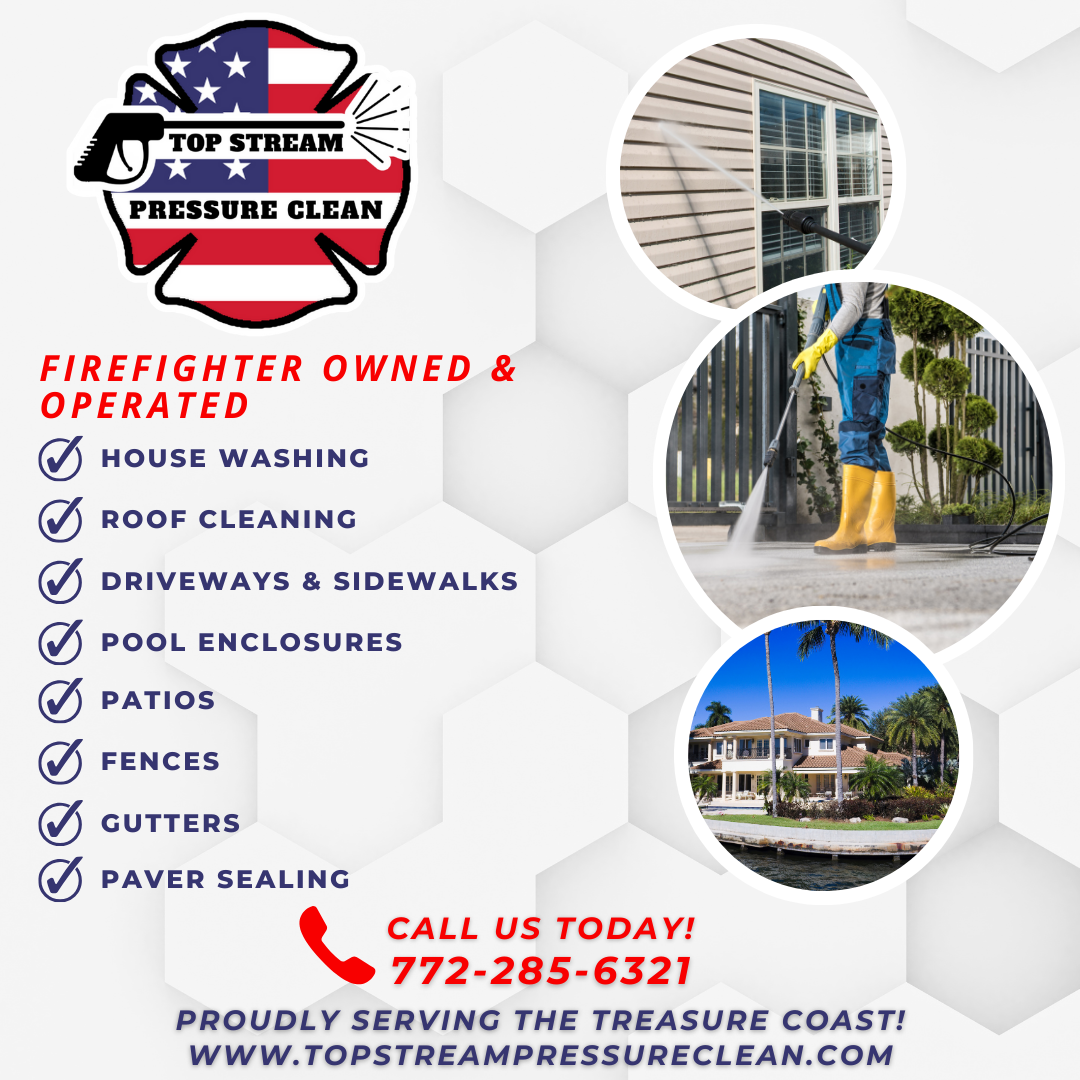 At Top Stream Pressure Clean, my team and I take pride in our hard work and dedication. We specialize in a range of pressure and soft washing services, including driveways, roofs, home exteriors, sidewalks, walkways, patios, pool decks, gutters and fence cleaning. Our soft wash system utilizes a low-pressure cleaning method, which gently removes algae, mildew, and stains with the help of detergents, without damaging your roof or other surfaces. Additionally, we offer trash and recycling can cleaning to keep your home or business looking pristine and well-maintained. We proudly serve Martin County, St. Lucie County, Indian River County, and more. We are fully licensed and insured, ensuring peace of mind for all our customers. With a commitment to outstanding service, we ensure your property receives the care and attention it deserves.